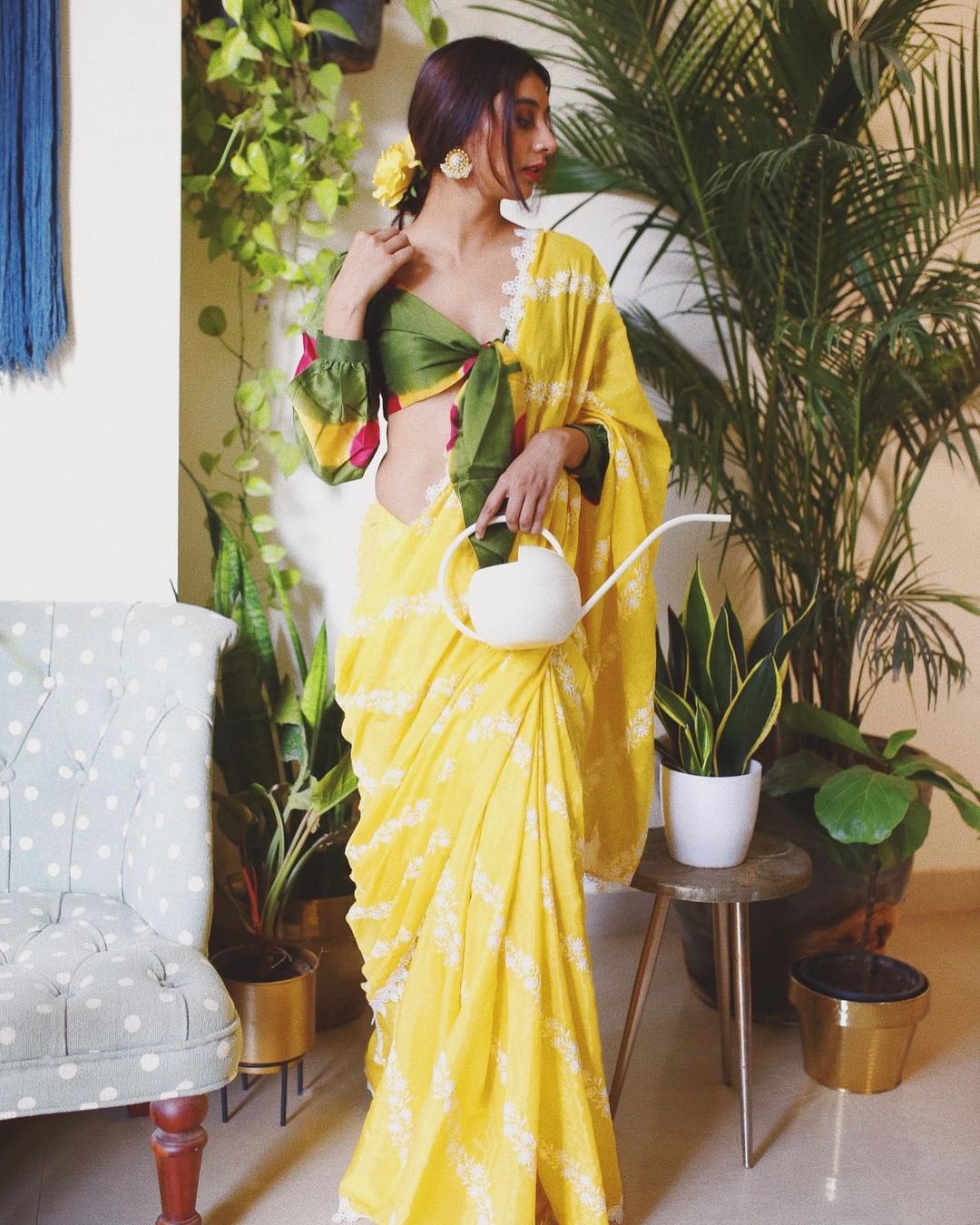 We’ve always loved Dolly’s style, right from her fashion blogging days. And when we saw this look of hers, we knew right away that we would have it in our Diwali lookbook for you all to take inspiration from. She is seen here wearing a dreamy yellow saree in Japanese silk fabric from Mulmul. And what sets this look apart is here choice of blouse. She has chosen to pair this saree with a tie-front silk blouse from Jodi. Paired with simple earrings with pearls to go with the white detailing on the saree, this look has an old world charm to it.