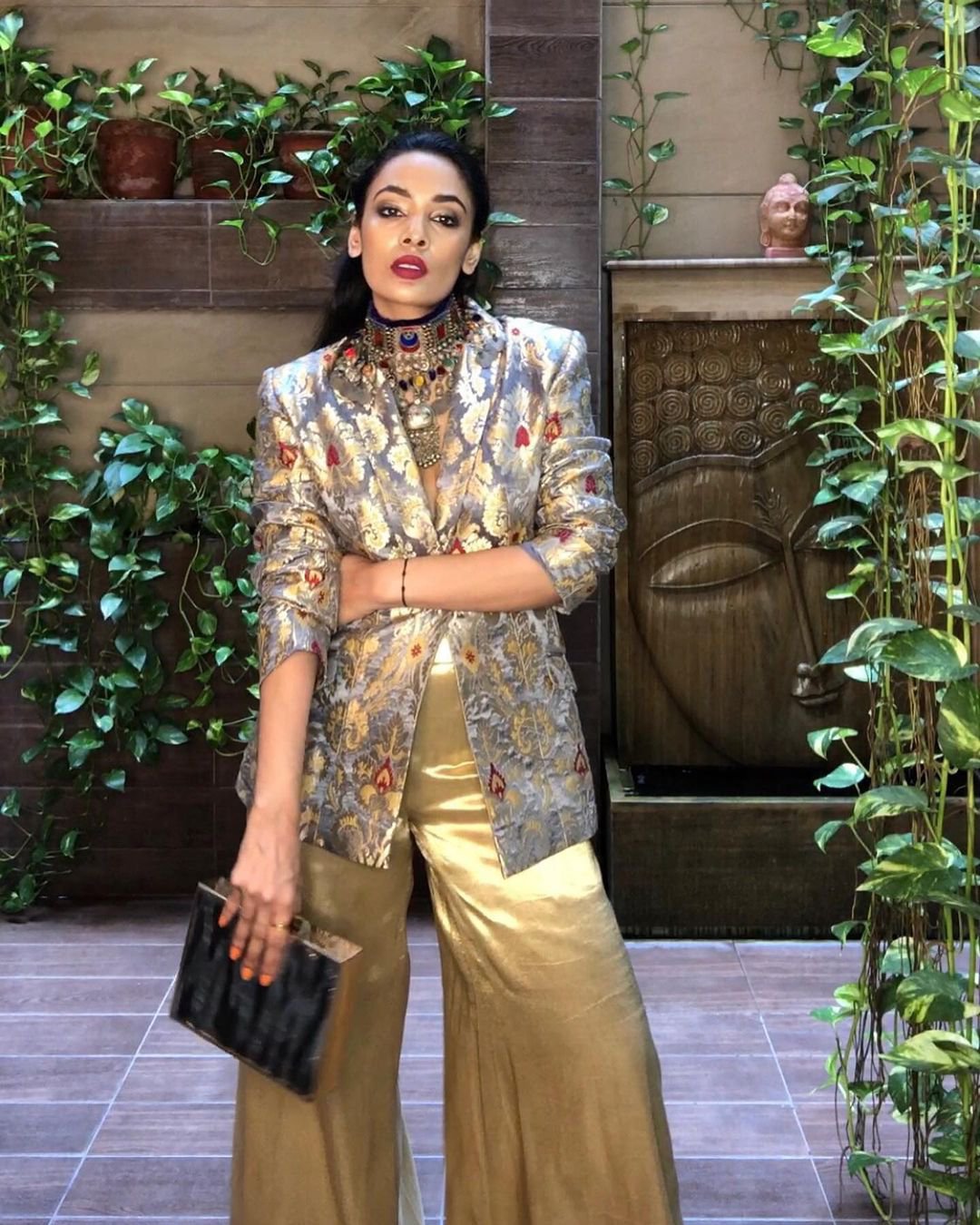 If you’re planning to go bold and edgy with your Diwali look this year then look no further as Ishita has the perfect outfit recipe for you. Gold palazzo trousers paired with a metallic brocade blazer, a statement Afghani necklace and simple box clutch will have all your virtual party guests raving about your outfit for days.