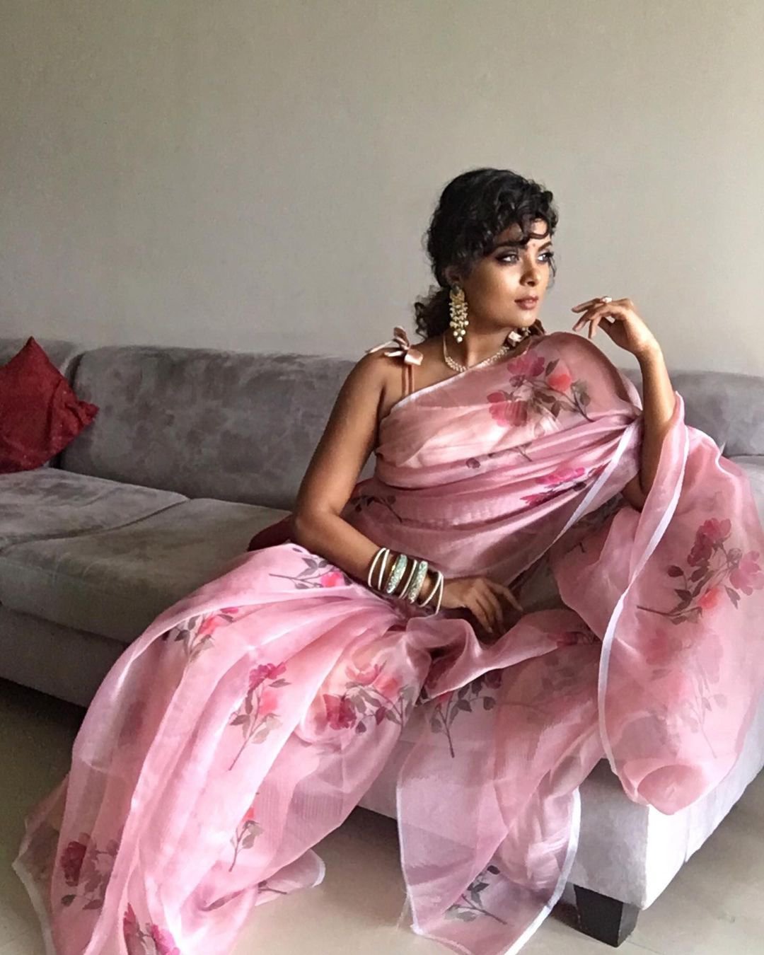 Known for her honest beauty reviews and expert make-up techniques, Jovita is one talented woman with a wonderful sense of style. And with organza sarees all the rage now, there was no way we couldn’t have featured this gorgeous look by Jovi. She has paired her dusty rose floral print organza saree with a cute satin crop top with tie details. To complete the look she has accessorised with pearl earrings and stack of bangles.