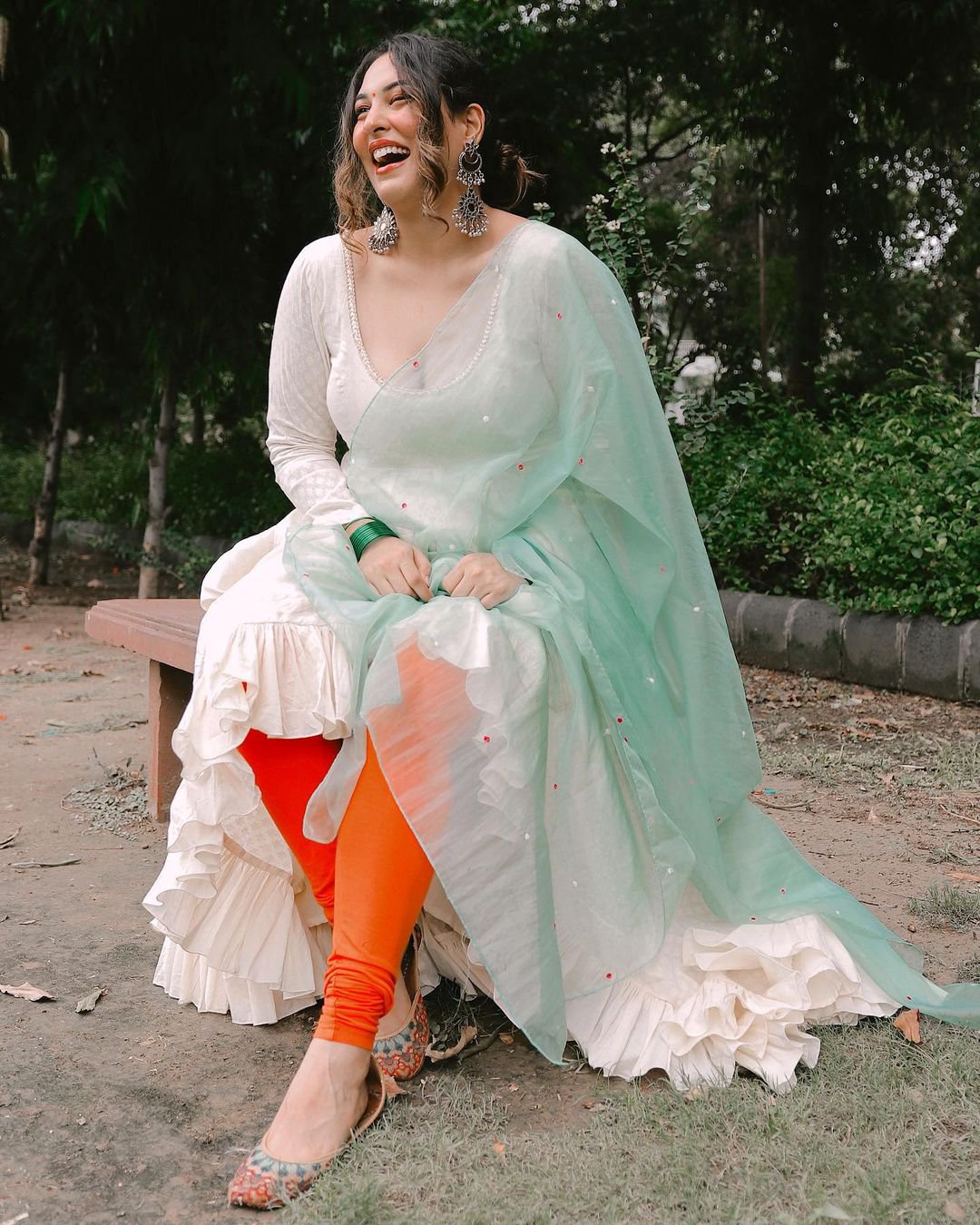 If you love a simple and minimal festive look, then you'll absolutely love this outfit idea by Sakshi Sindwani. She has paired her white ruffled hem kurta with a pair of vibrant orange leggings. To colour block it more, she has added a mint coloured dupatta. Accessorised with oxidised silver earrings and a pair of juttis, this stylish outfit is super easy to recreate.