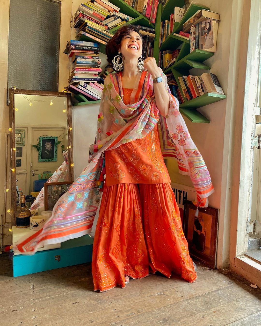 Sherry Shroff is India’s OG Youtube creator and has a sense of style that is both quirky and vibrant. Orange being one of her favourite colours, she is seen here wearing a beautiful Sharara set in the same hue by Sukriti and Aakriti. The set comes with a beautifully embroidered phulkari dupatta. Paired with statement earrings, this easy-breezy look is sure shot way to look fabulous this Diwali.